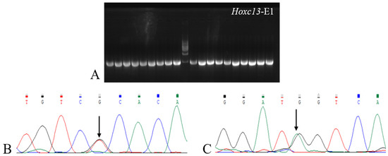 PCR amplification and sequencing results of Hoxc13-E1 in Gansu alpine fine-wool sheep. (A) is the PCR band plot of Hoxc13-E1 amplification product. (B,C) are Hoxc13 sequencing results. The overlapping peaks indicated by arrows are SNPs mutation sites.