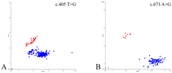 Results of KASP genotyping analysis of two positions of Hoxc13 gene in Gansu alpine fine-wool sheep. Horizontal and vertical coordinates for the two joints recognized by mutant base signaling, respectively. FAM is blue, HEX is green, and FAMHEX is red. Red and blue dots in (A) indicate TG and TT genotypes, respectively, and red and blue dots in (B) indicate AG and AA genotypes, respectively. Gray dots in plots (A,B) represent unrecognized signals.