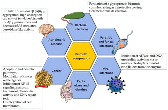 Many bismuth compounds have been prepared and some of them have reached the market, being principally applied in the clinical field. Presently, bismuth is being therapeutically explored in two main fields: antimicrobial and anticancer. In fact, bismuth can interact with nucleotides and amino acids in enzymes and other proteins, which is closely related to its uptake, accumulation, transport, and excretion in the human body, as well as to their antimicrobial and anticancer activities [31,32,33]. A summary of the biological properties of bismuth compounds as well as its main mechanisms of action are illustrated in Figure 1 and in Table S1 (Supplementary Materials).