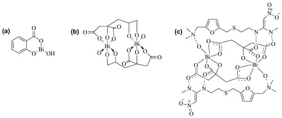 Chemical structures of (a) bismuth subsalicylate, (b) colloidal bismuth subcitrate, and (c) ranitidine bismuth citrate [35,36,37].