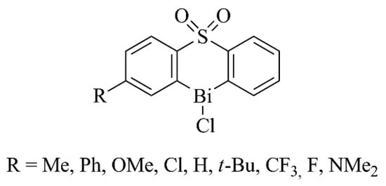 The antileishmanial and antifungal activity of bismuth compounds has also been explored [59]. An example is the work of Andleeb et al., who synthesized a set of heteroleptic triorganobismuth(V) biscarboxylates and found that some of them presented high activity against the promastigotes of Leishmania tropica [60]. Regarding antifungal properties, triarylbismuth dihalides and heterocyclicorganobismuth(III) compounds derived from diphenyl sulfones (Figure 4) displayed inhibitory action against Saccharomyces cerevisiae, probably due to the coordinated geometry of the bismuth atom [61,62].