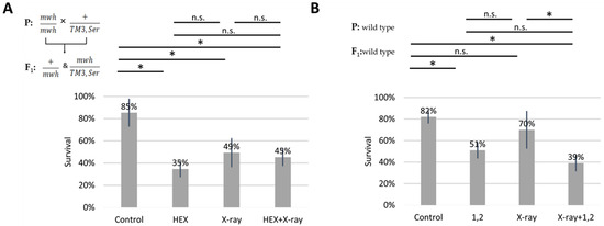 Effect of different hexanediols and genotoxic radiations on survival of Drosophila melanogaster. Survival is expressed in percent in the four indicated treatment groups showed on the diagram. On (A): HEX: 1,6-hexandiol and on (B): 1,2: 1,2-hexanediol was used to treat the larvae. The results are a summary of three independent measurements (n = 50). Parental (P) and F1 genotypes are shown in the top left corner for A and B. F1 larvae were treated as indicated. Statistical analysis was performed with Student’s t-test and the results are highlighted above the diagram (* p < 0.05, n.s.: non-significant).