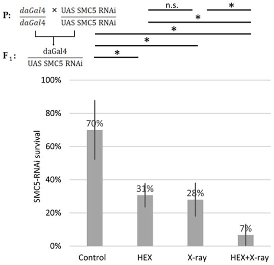 SMC5 silencing suppresses the rescue effect of X-ray on lethality induced by HEX. Survival is expressed in percent in the four indicated treatment groups showed on the diagram. The results are a summary of three independent measurements (n = 50). Parental (P) and F1 genotypes are shown in the top left corner. F1 larvae were treated as indicated. Statistical analysis was performed with Student’s t-test and the results are highlighted above the diagram (* p < 0.05, n.s.: non-significant).