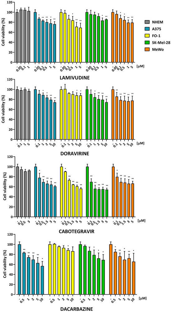 2.4. Effects of Lamivudine, Doravirine, and Cabotegravir on the Ability of SK-Mel-28, A375, FO-1, and MeWo Cells to Form Colonies in Soft Agar