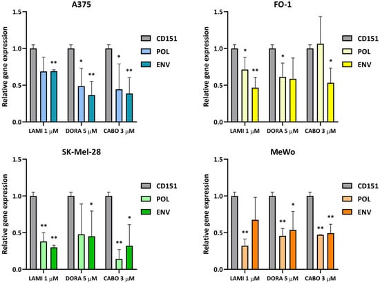 APA StyleZanrè, V., Bellinato, F., Cardile, A., Passarini, C., Monticelli, J., Di Bella, S., & Menegazzi, M. (2024). Lamivudine, Doravirine, and Cabotegravir Downregulate the Expression of Human Endogenous Retroviruses (HERVs), Inhibit Cell Growth, and Reduce Invasive Capability in Melanoma Cell Lines. International Journal of Molecular Sciences, 25(3), 1615. https://doi.org/10.3390/ijms25031615