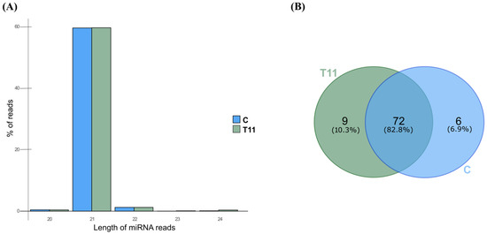 Overall, 1889 miRNA candidates were identified from a total of 3.3 million reads, aligning to their mature sequence and prediction of miRNA hairpin structures in the genome of tomato (Table S1). A count matrix output containing the raw counts of all miRNAs identified, as well as additional information that includes the pre-miRNA sequence and its secondary structure, the sequence of the mature miRNA and the sequence of the star miRNA (miRNA*), and the number of reads mapped to miRNA-5p/miRNA-3p (precursor, mature, star, and antisense) sequences for each of the replicates and conditions, is also presented in Table S1. Reads of 20–24 nt long miRNAs accounted for over 99.99% of the total number of reads that aligned against the miRNA candidates, among which 21 nt miRNA long reads were the ones that showed the greatest transcription overall, as they accounted for most of the sequencing reads (86.6% of all miRNA reads). Because bona fide miRNAs of 24 nt are rare to find in databases, and even though the annotation of miRNAs followed the miR–PREFeR pipeline criteria, a manual detailed review of the data generated by the algorithm was performed in order to improve accuracy and reduce noise when annotating. In our particular case, putative miRNAs with less than 10 read counts aligning to their miRNA* sequence were discarded. We found that each miRNA rises from a single pre-miRNA, which is scattered around the genome (Table S1). Taking these into account, only 87 out of the first-identified 1889 pre-miRNAs overcame this threshold (Table S1). The size distribution of these 87 miRNAs, and the amount of reads aligning to them, is shown in Figure 1A. From these miRNAs, nine of them were found exclusively for plants treated with strain T11, six solely for those untreated (C), and 72 for those under both conditions (Figure 1B). A principal component analysis (PCA) based on counts per million (CPM) values of the 87 identified miRNAs shows a separation of C and T11 samples, except for one of the T11 replicates (T11-R1) that clustered close to the control samples (Figure S1).