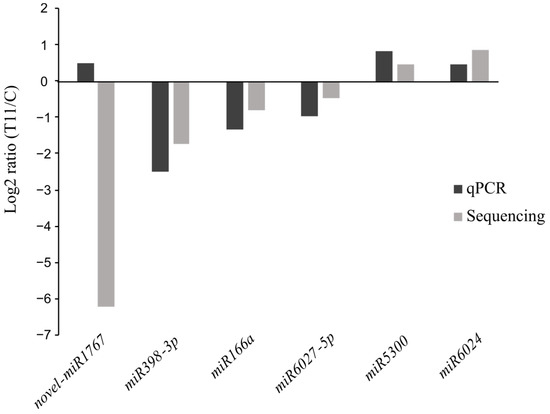 The DE analysis aimed to highlight those miRNAs that showed a differential level of expression (Wald test p-value < 0.05 and p-value adjusted using Benjamini and Hochberg’s method (padj) < 0.1) between the control and the T11-treated plants, regardless of their level of expression, towards their inclusion into further validation analyses. Fold-change values for the DE miRNAs were validated by a TaqMan® assay based on real-time quantitative PCR (qPCR) (Figure 3). Six miRNAs were selected for validation, with four downregulated and two upregulated in the T11-treated plants with regard to the C condition. These were, in turn, representative of the expression differences in both conditions (in terms of CPM), such as high transcription (miR166a), low transcription (novel miR1767), and intermediate transcription (miR6027-5p). A qPCR was performed after cDNA synthesis with the same RNA samples used for the construction of the six libraries and resulted in a high validation rate of the sequencing results. With the sole exception of the novel miR1767, which might be due to the low expression encountered for this miRNA, similar expression trends were observed for the miRNAs evaluated by RNA sequencing and qPCR (Figure 3). miRNA166a and miR398-3p showed significant differences in transcription for plants under C and T11 conditions in the qPCR analysis. Therefore, 83% of selected miRNAs were validated by qPCR.