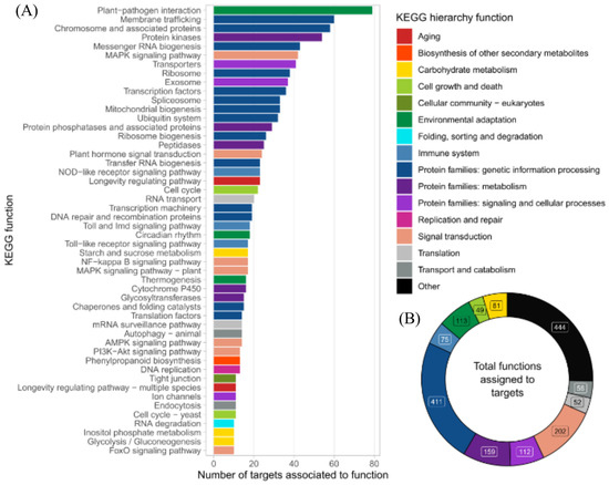 The target’s functional prediction based on the KEGG metabolic pathways database showed that most targets harbored functions related to main broad cell functions, including gene information and processing (n = 411, 23.4% of all targets), signal transduction (n = 202, 11.5%), and metabolism (n = 159, 9.1%) (Figure 4A,B). Strikingly, when deepening the pathway’s hierarchy, we found that those proteins associated with plant–pathogen interaction functions were the most abundant targets overall, highlighting the potential role of the DE miRNAs identified here to be involved in plant–microorganism crosstalk.