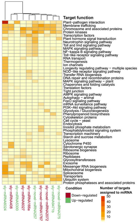 The prediction of the genes that are targets of the identified miRNA was performed by using psRNATarget against their reference S. lycopersicum genome (genome version SL4.0 and annotation version ITAG4.0). Plants treated with T11 showed 596 putative target genes for the upregulated miRNAs and 532 putative target genes for the downregulated ones. Over 84% of the target genes identified (n = 945) were predicted to be negatively regulated by miRNAs in a miRNA cleavage manner, while the remaining 16% (n = 183) might be translationally repressed by the miRNA’s mediation (Table S5).