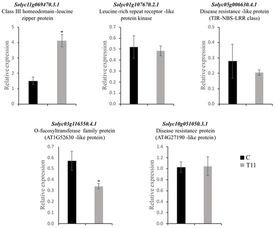 Real-time quantitative PCR (qPCR) analysis of five targets of differentially expressed (DE) miRNAs in Trichoderma atroviride T11-treated (T11) Solanum lycopersicum plants or untreated (C) plants libraries. The housekeeping gene Actin was used as the internal control, and error bars represent the SEM of three replicates. Asterisks indicate a significant difference as determined by Student’s t test (p < 0.05).