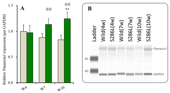 The expression of pannexin1 in the OFC of the wild type non-significantly and age-dependently decreased, whereas that of S286L-TG increased age-dependently from 4 to 10 weeks of age (Figure 1). In particular, the pannexin1 expressions at 4 weeks of age in the wild type and in S286L-TG were almost equal, but at 7 and 10 weeks of age, those of S286L-TG increased compared to the wild type (Figure 1).