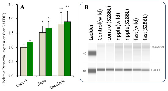 Therefore, the effects of chronic (for 7 days) ripple burst- and fast ripple burst-evoked stimulations in the expression of pannexin1 in the astroglial plasma membrane of the wild type and S286L-TG were also determined using capillary immunoblotting. The expression of pannexin1 in the astroglial plasma membrane of both the wild type and S286L-TG also increased frequency-dependently, since the increasing pannexin1 expression evoked by fast ripple burst was larger than those evoked by ripple burst-evoked stimulation (Figure 2).