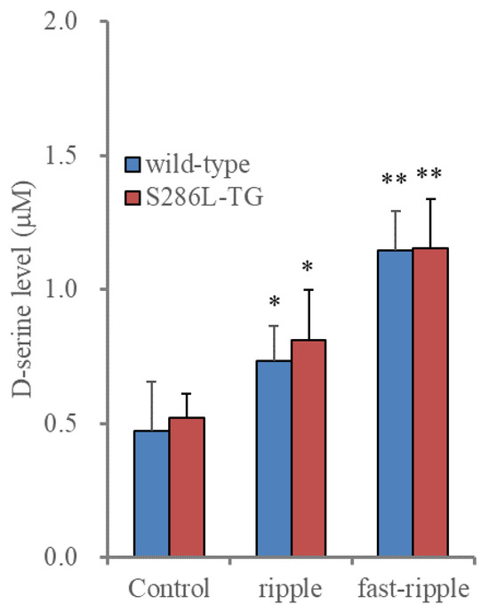 Acutely artificial high-frequency oscillation burst (HFO)-evoked releases of D-serine from cultured astrocytes of wild type and S286L-TG. Histogram represents the effects of HFO-evoked stimulation (ripple burst and fast ripple burst) on D-serine releases from cultured astrocytes of wild type (blue) and S286L-TG (red). Ordinates indicate the mean ± SD (n = 6) of extracellular D-serine level (μM) during the ripple burst- and fast ripple burst-evoked stimulation. * p < 0.05, ** p < 0.01 relative to control (basal release: non-stimulation) using two-way analysis of variance (ANOVA) with Scheffe’s post hoc test. F value was [FHFO(2,30) = 51.0 (p < 0.01), Fgenotype(1,30) = 0.7 (p > 0.1), FHFO*genotype(2,30) = 0.2 (p > 0.1)].