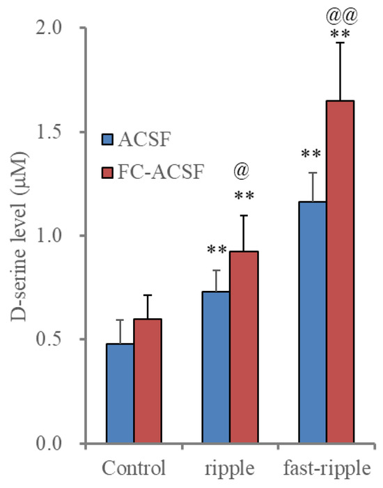 Effects of removal extracellular Ca2+ on astroglial HFO-evoked D-serine release. Histogram represents the HFO-evoked astroglial D-serine release from cultured astrocytes of wild type incubated in normal artificial cerebrospinal fluid (ACSF: blue) and Ca2+-free artificial cerebrospinal fluid (FC-ACSF: red). Ordinates indicate the mean ± SD (n = 6) of extracellular D-serine level (μM) during the ripple burst- and fast ripple burst-evoked stimulation. ** p < 0.01 relative to control (basal release: non-stimulation), @ p < 0.05, @@ p < 0.01 relative to ACSF using multivariate analysis of variance (MANOVA) with Scheffe’s post hoc test. F value was [FHFO(2,20) = 314.8 (p < 0.01), FACSF(1,10) = 9.4 (p < 0.05), FHFO*ACSF(2,20) = 15.0 (p < 0.01)].