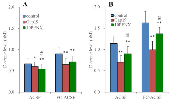 Effects of Gap19 and 10PANX on HFO-evoked astroglial D-serine release. Panel A indicates the effects of inhibitors of connexin43 (Gap19) and pannexin1 (10PANX) on ripple burst-evoked astroglial D-serine releases in ACSF and FS-ACSF. Panel B indicates the effects of Gap19 and 10PANX on fast ripple burst-evoked astroglial D-serine releases in ACSF and FS-ACSF. Ordinates indicate the mean ± SD (n = 6) of extracellular D-serine level (μM) during the ripple burst- and fast ripple burst-evoked stimulation. * p < 0.05, ** p < 0.01 relative to control, @ p < 0.05 relative to Gap19, using MANOVA with Scheffe’s post hoc test. F values in effects of ripple-evoked stimulation in ACSF and FC-ACSF on D-serine release from cultured astrocytes (in panel (A)) were [F(2,10) = 29.4 (p < 0.01)] and [F(2,10) = 26.4 (p < 0.01)] using MANOVA, respectively. F values in effects of fast ripple-evoked stimulation in ACSF and FC-ACSF on D-serine release from cultured astrocytes (in panel (B)) were [F(1.0,5.0) = 135.6 (p < 0.01)] and [F(2,10) = 77.0 (p < 0.01)] using MANOVA, respectively.