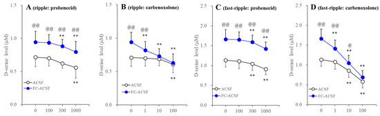 Concentration-dependent effects of probenecid and carbenoxolone on HFO-evoked astroglial D-serine release. Panels (A,C) indicate the concentration-dependent effects of probenecid (from 100 to 1000 μM) on ripple-evoked and fast ripple-evoked astroglial D-serine releases in ACSF (opened circles) and FC-ACSF (blue circles), respectively. Panels (B,D) indicate the concentration-dependent effects of carbenoxolone (from 1 to 100 μM) on ripple-evoked and fast ripple-evoked astroglial D-serine releases in ACSF (opened circles) and FC-ACSF (blue circles), respectively. Ordinates indicate the mean ± SD (n = 6) of extracellular D-serine level (μM) during the ripple burst- and fast ripple burst-evoked stimulation. Abscissas indicate concentration of probenecid and carbenoxolone (μM). ** p < 0.01 relative to control (0 μM), @ p < 0.05, @@ p < 0.01 relative to ACSF, using MANOVA with Scheffe’s post hoc test. F values in effects of probenecid on D-serine release in panels (A,C) were [Fprobenecid(3,30) = 21.1 (p < 0.01), FACSF(1,10) = 10.9 (p < 0.01), Fprobenecid*ACSF(3,30) = 0.3 (p > 0.1)] and [Fprobenecid(3,30) = 49.5 (p < 0.01), FACSF(1,10) = 27.2 (p < 0.01), Fprobenecid*ACSF(3,30) = 0.3 (p > 0.1)], respectively. F values in effects of carbenoxolone on D-serine release in panels (B,D) were [Fcarbenoxolone(3,30) = 71.7 (p < 0.01), FACSF(1,10) = 2.1 (p < 0.01), Fcarbenoxolone*ACSF(3,30) = 21.6 (p < 0.01)] and [Fcarbenoxolone(3,30) = 338.9 (p < 0.01), FACSF(1,10) = 7.5 (p < 0.05), Fcarbenoxolone*ACSF(3,30) = 25.5 (p < 0.01)], respectively.