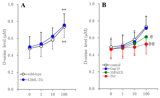 In the above study, the abnormalities of the pannexin1 expression in the astrocytes of S286L-TG could not be detected when compared to the wild type. Therefore, consequently, to explore the functional abnormalities in the astroglial transmission in S286L-TG, the release of D-serine, a major gliotransmitter, from cultured astrocytes of the wild type and S286L-TG was determined. The basal astroglial release of D-serine was almost equal in the wild type and S286L-TG (Figure 3).
