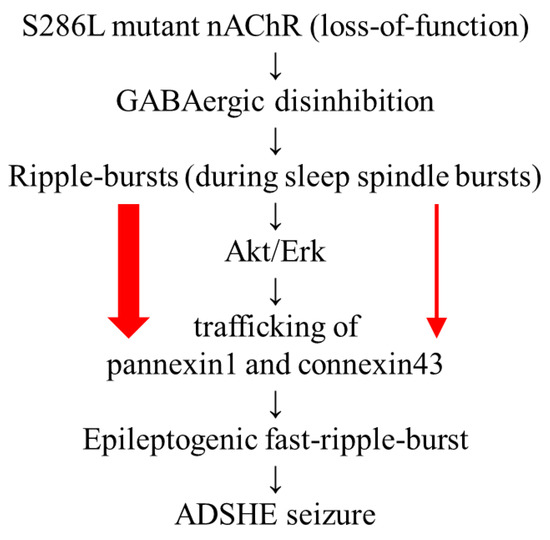 Hypothetical age-dependent pathomechanisms of ADSHE in S286L-TG. Impaired S286L-mutant nAChR leads to GABAergic disinhibition, resulting in enhanced propagation of physiological ripple burst excitabilities [8,9,10,13,14]. The hyperexcitability increases intracellular signaling of Akt and Erk, which enhance trafficking of pannexin1 and connexin43 to the astroglial plasma membrane [8,11,12]. Increased expression of pannexin1 and connexin43 is also functionally activated by ripple burst [8,11]. The activation of pannexin1-hemichannels is probably more sensitive and earlier than that of connexin43-hemichannels due to the pannexin1-hemichannel functional features, such as depolarization dependency and extracellular Ca2+ independency. These signaling cascades contribute to development of epileptogenic fast ripple bursts.