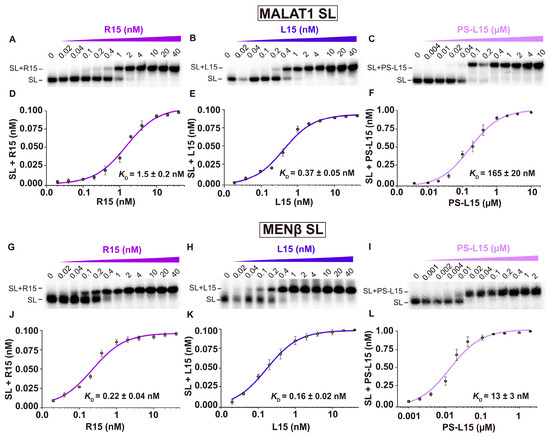 Previously, the R15 oligonucleotide, whose sequence is A9GCA4, was shown to interact with the MALAT1 SL using a native electrophoretic mobility gel-shift assay (EMSA) [16]. To determine if the LNAs L15 and PS-L15 interact with the MALAT1 SL, we employed a native EMSA to determine the apparent equilibrium dissociation constants (KD,app) (Figure 2, Table 1). The EMSA showed two distinct gel bands: one for the free SL and one for the oligonucleotide bound to the SL, presumably via the U-rich internal loop (Figure 2A–C). The KD,app values obtained for the R15, L15 and PS-L15 binding to the MALAT1 SL were 1.5 ± 0.2 nM, 0.37 ± 0.05 nM and 165 ± 20 nM, respectively (Figure 2D–F, Table 1). Despite the rigidity of an all-LNA backbone, L15 showed the tightest binding to the MALAT1 SL. Because MENβ has a U-rich internal loop that can theoretically engage with L15 and PS-L15, we repeated the EMSA using the MENβ SL in the presence of R15, L15 and PS-L15 and determined KD,app values of 0.22 ± 0.04 nM, 0.16 ± 0.02 nM and 13 ± 3 nM, respectively (Figure 2G–L, Table 1). The MENβ SL + oligonucleotide complexes are tighter than the MALAT1 counterparts. We speculate that the shorter MENβ triple helix likely has greater flexibility to accommodate more optimal base triples (i.e., R•L Hoogsteen and L-R Watson–Crick base pairs) for the relatively inflexible all-LNA oligonucleotides [59,60,61].