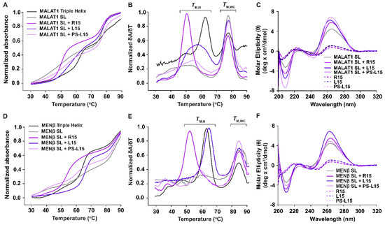 The formation of a triple-helical structure was further probed using circular dichroism (CD) spectroscopy (Figure 3C). The CD spectrum of each oligonucleotide (i.e., R15, L15 and PS-L15) did not show any remarkable peaks, whereas the MALAT1 SL displays a minimum at ~210 nm and maximum at ~265 nm, similar to the A-form duplex structure [27]. When the MALAT1 SL is in the presence of the oligonucleotides R15, L15 and PS-L15, a larger difference in the molar ellipticity (θ), both at ~210 and ~265 nm, was observed in addition to weak maxima at ~220 nm and weak minima at ~244 nm. Strong peaks at 210 and 270 nm have been observed previously for RNA triple helices, including the MALAT1 triple helix [27,57,68,69]. Finally, for both the UV and CD spectra, similar trends were observed when the MENβ SL bound to R15, L15 and PS-L15 (Figure 3D–F), except for two deviations: (i) the TM,H and TM,WC values are slightly greater than they are for the MALAT1 counterparts, as observed previously [16], and (ii) the Hoogsteen peaks are consistently tall and narrow, suggesting a fully formed triple helix (Table 2). Altogether, our UV and CD spectroscopic results are consistent with the presence of a triple helix; therefore, we conclude that the LNA-based A-rich tracts can facilitate RNA•LNA-RNA triple-helix formation with the U-rich internal loops of both the MALAT1 and MENβ SLs in a test tube.