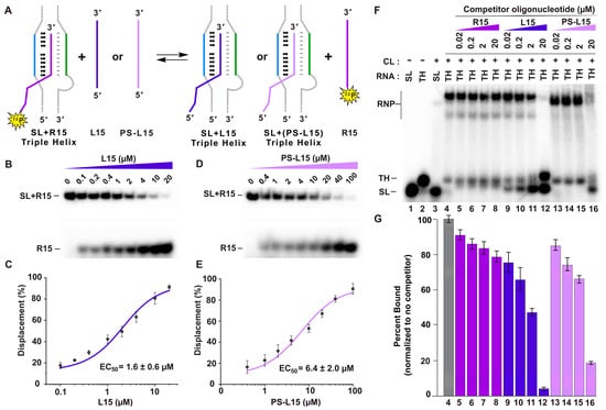 Competitive EMSA for the LNAs (L15 and PS-L15) displacing RNA (R15) from MALAT1 SL + R15 complex and METTL16 (found in HCT116 cell lysate) from wild-type MALAT1 triple helix. (A) Cartoon schematic showing the displacement of 5′-[32P]-radiolabeled R15 (purple) from SL + R15 complex by L15 (dark purple) or PS + L15 (light purple) to form SL + L15 or SL + (PS-L15) complexes. (B,D) Representative gel images and (C,E) binding curves for the displacement of R15 by L15 and PS-L15 from MALAT1 SL + R15 complex. The gel images show dissociation of [32P]-radiolabeled R15 from SL + R15 complex as increasing amounts of L15 or PS + L15 are added. EC50 is the concentration corresponding to 50% displacement. (F) Representative gel image and (G) bar graph plot for the 5′-[32P]-radiolabeled MALAT1 SL and MALAT1 TH in the presence of HCT116 cell lysate (CL) and increasing amounts of competitor oligos R15 (purple), L15 (dark purple) and PS-L15 (light purple). RNP complex formed when METTL16 binds to MALAT1 triple helix but not the MALAT1 SL. The bar graph shows RNP complex formation normalized to no competitor, which was set to 100%. Error bars represent standard deviation from three independent runs.