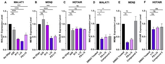 RT-qPCR results showing changes in expression for (A) MALAT1, (B) MENβ and (C) HOTAIR RNA when HCT116 cells were transfected with ~0.4 μM of A28, R15, L15 and PS-L15. RT-qPCR results showing changes in expression for (D) MALAT1, (E) MENβ and (F) HOTAIR RNA when HCT116 cells were transfected with 1 μM of L15 or PS-L15 or treated with 1 µM of compound 5. The expression values were first normalized with respect to U6 small nuclear (snRNA) and these values were then normalized with respect to the no oligo/DMSO treated values set at 1. Results represent the mean ± SD of biological triplicates (n = 3). **** p-value < 0.0001, *** p-value < 0.0002, ** p-value < 0.0021 < * p-value < 0.033, ns = p-value < 0.1234 using two-way ANOVA test. Software used for statistical analysis was GraphPad Prism 8.0.1 (RRID:SCR_002798).