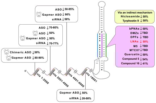 Summary of therapeutic strategies and effectiveness in lowering MALAT1 levels. ASOs used to target human MALAT1 include nts 2001–4000 [32,46], 4001–6000 [38,45] and nts 2001–4000 [38] on mouse MALAT1. Gapmer ASOs targeting human MALAT1 nts 6001–8000 [40] and mouse MALAT1 nts 1–2000 [34,42], 2001–4000 [39], 4001–6000 [38]. siRNAs used to target human MALAT1 nts 2001–4000 [35,36], 4001–6000 [36], 6001–8000 [35,36]. Chimeric ASO used to target mouse MALAT1 nts 1–2000 [43]. Niclosamide and tyrphostin 9 target MALAT1 triple helix via an indirect mechanism [21]. Direct targeting of MALAT1 triple helix by bPNAs [47], DMZs [26], DPFs [22], LNAs [this study], M5 [28], MTC07 [25], quercetin [27], compound 5 [23], and compound 16 [23]. To the best of our knowledge, the sequences of gapmer ASOs used to target MALAT1 in Ref. [11] were not disclosed. A down arrow (↓) denotes the lowering of MALAT1 levels, mouse cartoon denotes use of therapeutics in mice, TBD represents “to be determined” and red font denotes results from this study. Please note that the schematic extends beyond 8000 nts to account for ASOs targeting human MALAT1.