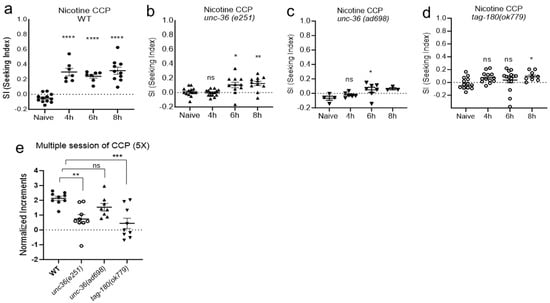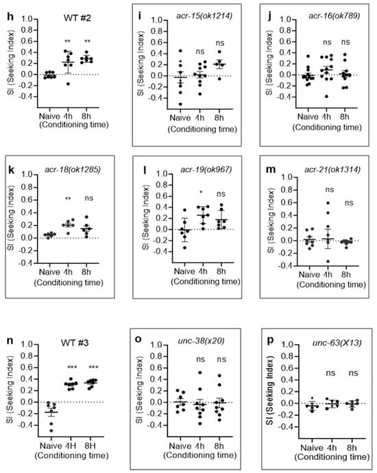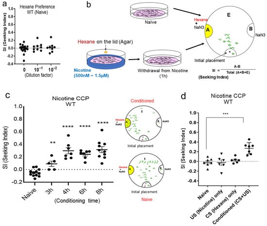 Adapting the mammalian Conditioned Place Preference (CPP) [,,], a form of associative learning used to study the rewarding effects of drugs, we developed nicotine CCP and determined nicotine preference and seeking in C. elegans. Initially, we identified hexane, an alkane volatile odorant, as a suitable neutral stimulus for conditioning. Despite testing a spectrum of hexane concentrations, a discernible preference for hexane was not observed in C. elegans at the investigated levels (Figure 1a). Subsequently, we embarked on classical conditioning, utilizing nicotine as an Unconditioned Stimulus (US) (Figure 1b), grounded in insights garnered from preceding studies that explored behavioral and physiological responses across various nicotine concentrations []. Notably, C. elegans exhibits an initial response to nicotine, marked by heightened motility at an approximately 1.5 μM concentration [], although concentrations as high as 100 µM induce locomotor paralysis, attributed to the acute activation of acetylcholine-sensitive ion channels in the worm’s motor neurons and muscles []. Moreover, C. elegans exhibits motivated behaviors induced by nicotine across a spectrum of concentrations, as detailed in previous studies []. Additionally, withdrawal from nicotine manifests as an enhanced stimulated locomotion, acting as a pronounced symptom in the context of nicotine withdrawal. Therefore, we applied various concentrations, including a 1.5 μM concentration, to induce nicotine-dependent locomotor stimulation and conducted our CCP assays accordingly. Wild-type animals successfully developed the acquisition of nicotine CCP in a time-dependent manner (Figure 1c) and successfully elicited preference even at concentrations higher than 1.5 μM but not paralytic. The Seeking Index (SI) was obtained, as represented in Figure 1b, with a high SI indicating that the nicotine-paired cue acted as a strong attractant, corresponding to the development of preference via conditioning with the reinforcing drug. Crucially, CCP did not manifest when the Unconditioned Stimulus (US) or Conditioned Stimulus (CS) was presented in isolation, affirming that conditioning occurred and facilitated CCP solely when the CS was paired with the US (Figure 1d).