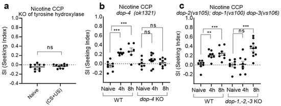 Furthermore, we demonstrated that dopamine signaling mediates CCP induced by nicotine (Figure 2). The impairment of CCP development was prominently observed in KO mutant animals of cat-2, tyrosine hydroxylase in C. elegans, which was dopamine deficient (Figure 2a). In mammals, nicotine increases the firing rate of midbrain dopamine neurons by stimulating α4β2nAChRs, promoting nicotine dependence via the dopamine receptor []. Dopamine receptors are classified into two subfamilies: D1-like (D1 and D5) and D2-like (D2, D3, and D4). In mammals, nicotine-induced CPP is associated with the elevation of D1 and D2 receptor levels in both NAc and CA1 regions and mediated via both D1- and D2-like dopamine receptors []. Correspondingly, we extended our investigation to assess the dopamine receptors in C. elegans, revealing that dop-4, the D1-like dopamine receptor [,,], exhibited the impaired development of CCP (Figure 2b). In concordance, although the deficiency of the remaining three dopamine receptors resulted in the delayed development of CCP, intact DOP-4 eventually induced successful CCP (Figure 2c). This highlights the integral role of dop-4 in CCP manifestation, underscoring its significance within the dopaminergic signaling cascade.