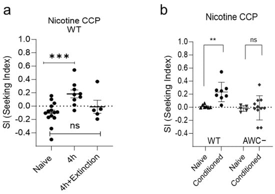 Wild-type animals can represent the extinction of CCP, greatly reducing paired rewarding. The expression of nicotine-induced CCP was abolished in subsequent chemotaxis assays after the presentation of CS (hexane) alone in the absence of US (nicotine) during the withdrawal period (Figure 3a), feasibly suggesting that CCP can be used to investigate the genes and pathways associated with reinstatement. To further investigate the mechanism involved in the regulation of CCP in the neural circuits, we explored the neural circuits mediating the acquisition of positive valence towards the Conditioned Stimulus (CS), which, post-conditioning, transitioned from being neutral to acting as an enticing cue. Chemotaxis behaviors are regulated primarily by the chemosensory neurons and modulated by the integration of signaling with interneurons [,]. C. elegans have 32 presumed chemosensory neurons that detect a variety of olfactory and gustatory cues [,,,]. In worms, AWC and AWA, ciliated chemosensory neurons, mediate attraction to the volatile odorants []. We exploited AWC-ablated animals to test in CCP. Killing a pair of AWC neurons via the expression of reconstituted Caspase [,] resulted in impaired CS (hexane) preference after conditioning with US (nicotine) (Figure 3b), suggesting that putative primary sensory neurons are AWC head neurons for attraction to hexane after conditioning.