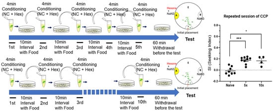 CCP is specifically elicited by nicotine. The short time of repeated conditioning (1 min, without food during conditioning) and withdrawal elicits successful CCP. A conditioning session (nicotine and hexane) was 1 min, and 10 min of withdrawal was followed. After multiple sessions of conditioning, the last withdrawal session was consistent as 60 min before conducting chemotaxis to CS. Each dot represents trial of population assay. *, p < 0.05; ***, p < 0.001 (Mann–Whitney test). (n ≥ 8).
