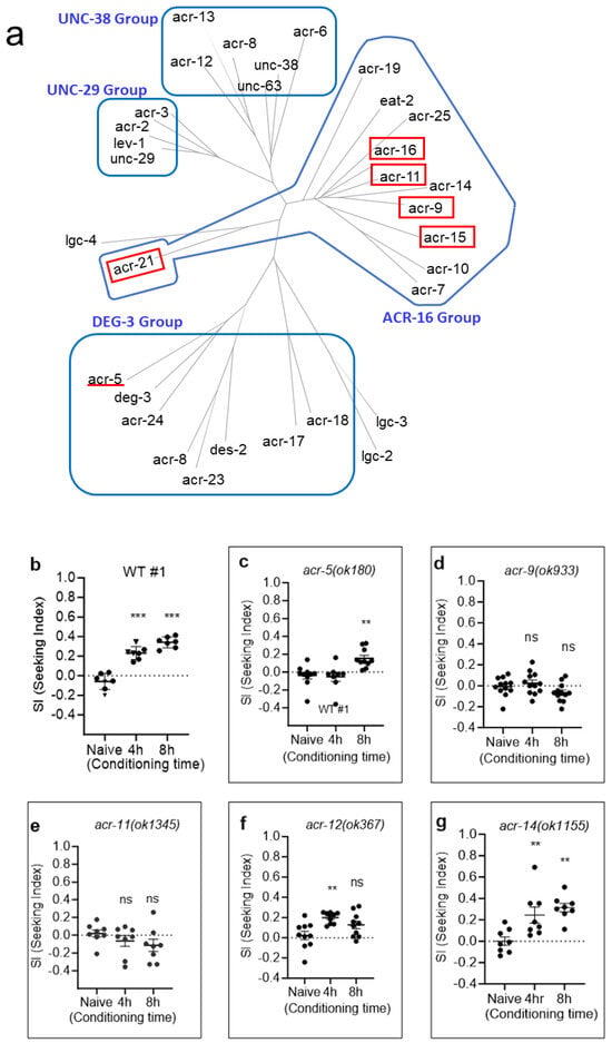 Functional nAChRs are homopentameric or heteropentameric channels composed of five subunits by a combination of the α(α2–α10) and β(β2–β4) subunits [,,,]. We tested nAChR subunit KO mutant animals in CCP assay. A total of 29 nAChR homologs are reported in the C. elegans genome, whereas 17 are reported in mammals [,]. These nAChRs were classified into five groups, which were the ACR-16 group, UNC-29 group, UNC-38 group, ACR-8 group, and DEG-3 group []. We screened 12 nAChR mutants by the CCP assay, focusing on the ACR-16 group, which closely resembles the mammalian α7-nAChR subunit, a predominant subtype in the brain [,]. Here, we present consistent results with previous findings and also newly identified additional nAChR subunits associated with nicotine-induced motivated behaviors (Figure 5). In a single session of chronic CCP analysis, we identified the delayed development of CCP in KO mutants of acr-5, and it was impaired in acr-15 and acr-16, which is compatible with previous reports on the nicotine-dependent locomotion of worms (Figure 5). Furthermore, we also identified the impaired development of CCP in KO mutants of acr-9, acr-11, and acr-21 (Figure 5). The expression enrichment profile, provided by a single-cell gene expression profile of every neuron type in C. elegans (CeNGEN) [], shows that acr-9 is expressed in AVA, a crucial interneuron validated for the development of nicotine-dependent locomotion, in which acr-15 and acr-16 are expressed []. Recently, the AVA interneurons have been shown to participate in the integration of sensory-motor input and decision making []. Interestingly, acr-21, the nAChR α9 (CHRNA9) ortholog, is enriched in the RMG [], the gap junctional hub interneurons that electrically connect to many sensory, motor, and interneurons, and is known to modulate pheromone attraction and social behavior []. RMG neurons form a close connection with AVA and ADA neurons, and acr-11, which we newly identified to play a role in nicotine CCP, is reported to be enriched in ADA. We also identified that the unc-63 and unc-38 mutants were defective in the development of CCP. This result is consistent with previous investigations into the nicotine-dependent stimulation of locomotion; however, a further comprehensive analysis will be required as both mutant animals, unc-63 and unc-38, are not severely uncoordinated as described [,,]. Nonetheless, our results demonstrate that the nicotine-elicited conditioned cue preference is mediated by nAChRs.