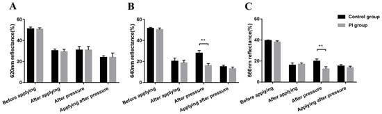 Reflectance of skin coated with three tracers of different molecular weights. PI: pressure injury. ** p < 0.01. (A) Reflectance of skin coated with EB. (B) Reflectance of skin coated with PB. (C) Reflectance of skin coated with MB.