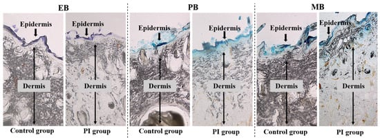 Histological observation of skin coated with three tracers of different molecular weights. PI: pressure injury. EB: Evans Blue. PB: Patent Blue. MB: Methylene Blue.