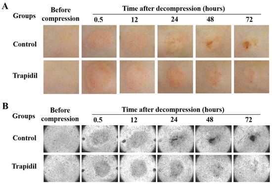 Changes in PI skin in control and Trapidil groups using a digital camera (A) and a UV camera (B).