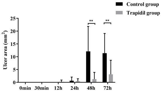 As shown in Figure 5, areas of ulcers were not found in either group after 30 min of decompression. At 48 h and 72 h after decompression, the areas of ulcers in the Trapidil group were (1.28 ± 2.62) mm2 and (3.15 ± 5.48) mm2, the areas of ulcers in the control group were (12.12 ± 9.75) mm2 and (11.40 ± 7.72) mm2, and the differences were statistically significant (all p < 0.01).