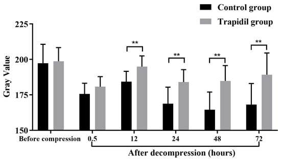 Previous studies have shown that the gray value (GV) can be calculated from photos taken by UV cameras, which can predict the changes in PIs, and the lower the GV of PIs, the higher the severity of PIs []. As shown in Figure 6, at 12 h (p < 0.01), 24 h (p < 0.01), 48 h (p < 0.01), and 72 h (p < 0.01) after decompression, the GVs in the Trapidil group were significantly higher than those in the control group, and the differences were statistically significant.