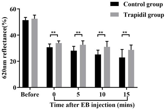 As shown in Figure 7, those in both the control and Trapidil groups gradually darkened in color after EB injection. The control group had a deeper periphery, a shallower interior, and a larger area. The overall color of the Trapidil group was darker than normal skin but lighter than the peripheral part of the control group. Figure 8 shows the spectral measurement of the control and Trapidil groups after EB injection. The reflectivity of both groups showed a decreasing trend, indicating that the colors in both groups became darker, which was consistent with the macroscopic observation results. The reflectivity of the control group was lower than that of the Trapidil group at various time points after EB injection.