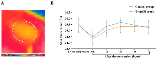 Under normal conditions, the skin temperature of the control group was (35.43 ± 0.56) °C and that of the Trapidil group was (35.45 ± 0.51) °C. From 30 min to 48 h after decompression, the temperature in the control group was higher than that in the Trapidil group. Although none of the differences were statistically significant, at 24 h after decompression, the skin temperature in the control group was (35.68 ± 0.44) °C and that in the Trapidil group was (35.33 ± 0.49) °C, p = 0.087 (Figure 9).
