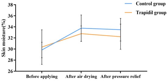 As shown in Figure 10, regarding skin moisture, there was no significant difference between the control and Trapidil groups at all observation points (p = 0.60, 0.23, and 0.17, respectively).