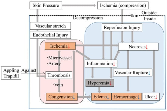Topical skin application of small-molecule antiplatelet agent against pressure injuries. The mechanism of pressure injuries is from reference []. Red arrow (↓) means a reduction compared with the control group in this study. Blue arrow (↓) means a predicted reduction compared with the control group, which needs to be confirmed in future studies.