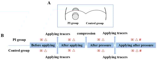 The skin condition of the rat was photographed using a digital camera (Opti WG-3 PENTAX, Tokyo, Japan) before and after applying tracers and before and after pressure. Macro images of three different tracers applied to normal skin and PI skin were taken. The distance between the camera and the skin was fixed at 20 cm with a fixed device, and the shooting magnification was 2 times. The whole PI skin was photographed.