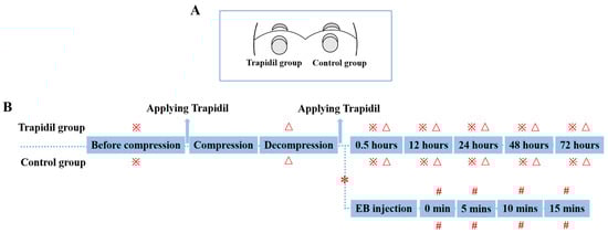 Grouping (A) and protocol (B) in second part of the study. ※: macroscopic observations, UV observations, measurement of gray value, skin temperature, skin moisture. △: measurement of occurrence rates and areas of ulcers. #: macroscopic observation and spectroscopic measurement. *: Another set of Trapidil and control groups (previous steps were the same).