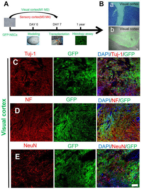 Schematic diagrams showing the mechanical injury protocol and histological images of transplanted GFP-labeled NSCs in the visual cortex. (A) Schematic of the mechanical injury protocol and cell transplantation into the macaque sensory/visual cortex. (B) a, The lesion site appeared as a hole before transplantation; b, transplantation of GFP-marked NSCs into the mechanical damage of the macaque visual cortex after 1 year. (C–E) Transplanted NSCs (GFP, green) differentiated into mature neurons in the injured area of the macaque visual cortex (Tuj-1/NF/NeuN, red); scale bar: (B): a, b: 100 µm; (C–E): 100 µm.