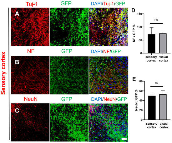 Histological images of transplanted GFP-labeled NSCs in the injured macaque sensory cortex. (A–C) Transplanted NSCs (GFP, green) differentiated into mature neurons in the injured area of the macaque sensory cortex (Tuj-1/NF/NeuN, red); scale bar, 100 µm. (D) NeuN expression was not different between the sensory cortex and visual cortex, and (E) NF expression was not different between the sensory cortex and visual cortex; ns denotes p > 0.05, means there was no significant difference.