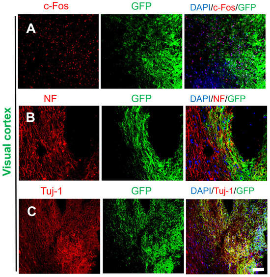 Although the majority of transplanted cells in the visual cortex and sensory cortex remained at the transplant sites (damage sites), some of the transplanted cells migrated away from the damage sites as individual cells or clusters at the border between the host brain tissue and the graft. c-Fos is an immediate early gene and proto-oncogene that is highly expressed in active cells and is useful for studying cellular activity in the brain. c-Fos is co-expressed with neuronal markers (NF, NeuN), and staining for c-Fos is used to determine whether neurons differentiated from transplanted NSCs are active []. Figure 3A shows that c-Fos was expressed in both GFP+ and GFP− cells (host cells), and as shown in Figure 3B,C, NF/Tuj-1-positive nerve fibers comprised GFP+ and GFP− cells. The staining patterns of c-Fos, NF, and Tuj-1 did not differ between host neurons and GFP+ neurons.