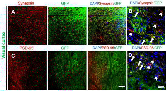 Synapsin I, a major phosphoprotein found in synaptic vesicles and located in the presynaptic membrane, was used as a marker to identify presynaptic terminals []. Some presynaptic terminals of host neurons (Synapsin I+/GFP−) were identified within the graft (Figure 4A). This result, taken together with the postsynaptic density protein-95 (PSD-95) [] staining data, showed that a large number of host-neuron-derived synapses were formed on differentiated neurons in the transplantation site (Figure 4C), and the enlarged figures of the edge of grafts also show potential connections to host tissue (Figure 4B,D). These results possibly provide an anatomical basis for integration between host neurons and transplanted NSCs.