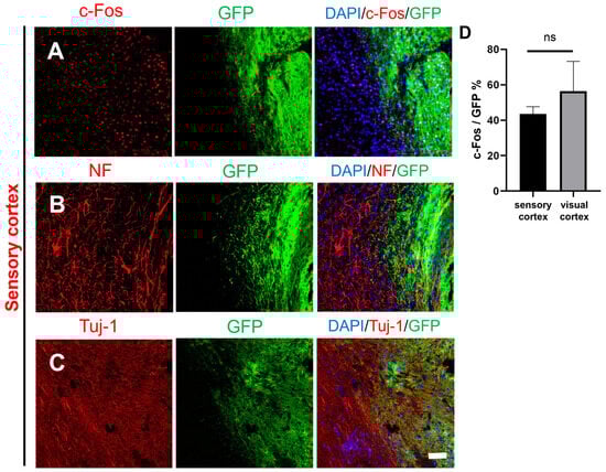 Histological images of transplanted GFP-labeled NSCs in the border between the graft and host tissue in the sensory cortex. (A) The transplanted NSCs (GFP) differentiated into active cells (DAPI, blue; GFP, green; c-Fos, red). (B–C) The transplanted NSCs (GFP) differentiated into mature neurons at the graft edge (DAPI, blue; GFP, green; Tuj-1, red; NF, red); scale bar, 100 µm. (D) c-Fos expression was not different between the sensory cortex and visual cortex; ns denotes p > 0.05.