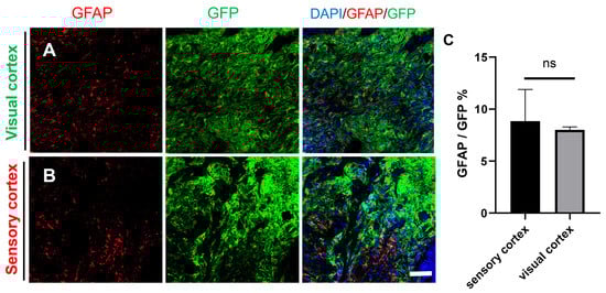 The transplanted NSCs differentiated into astrocytes in the visual cortex and the sensory cortex. (A) The transplanted NSCs (GFP) differentiated into astrocytes in the visual cortex (DAPI, blue; GFP, green; GFAP, red). (B) The transplanted NSCs (GFP) differentiated into astrocytes in the sensory cortex (DAPI, blue; GFP, green; GFAP, red); scale bar, 100 µm. (C) GFAP expression was not different between the sensory cortex and visual cortex; ns denotes p > 0.05.