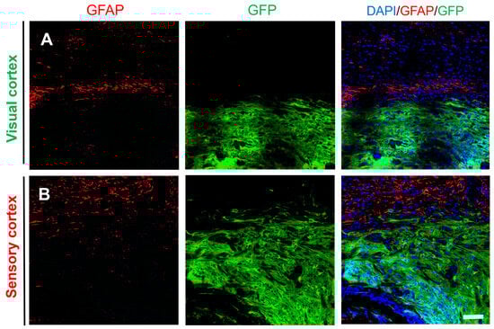 In vitro, NSCs can differentiate into glial cells, which express markers of astrocytes (glial fibrillary acidic protein (GFAP)). Therefore, GFAP staining was also performed on graft tissue sections. Immunohistology showed that in both the visual cortex and sensory cortex, some GFP+ cells expressed GFAP, indicating that some of the grafted NSCs differentiated into glial cells. However, no glial scar was observed at the edge of the injury site (Figure 6A,B), and statistical analysis showed that there was no significant difference in the expression of GFAP between the visual cortex and the sensory cortex, as shown in Figure 6C. In addition, the expression of GFAP at the edge of the grafts both in the visual cortex and the sensory cortex showed no obvious glial scars in both GFP+ and GFP− tissues (Figure 7A,B). These results suggested that the formation of connections between newborn neurons and host neurons was not impeded and demonstrated the feasibility of NSCs to repair the damage sites.